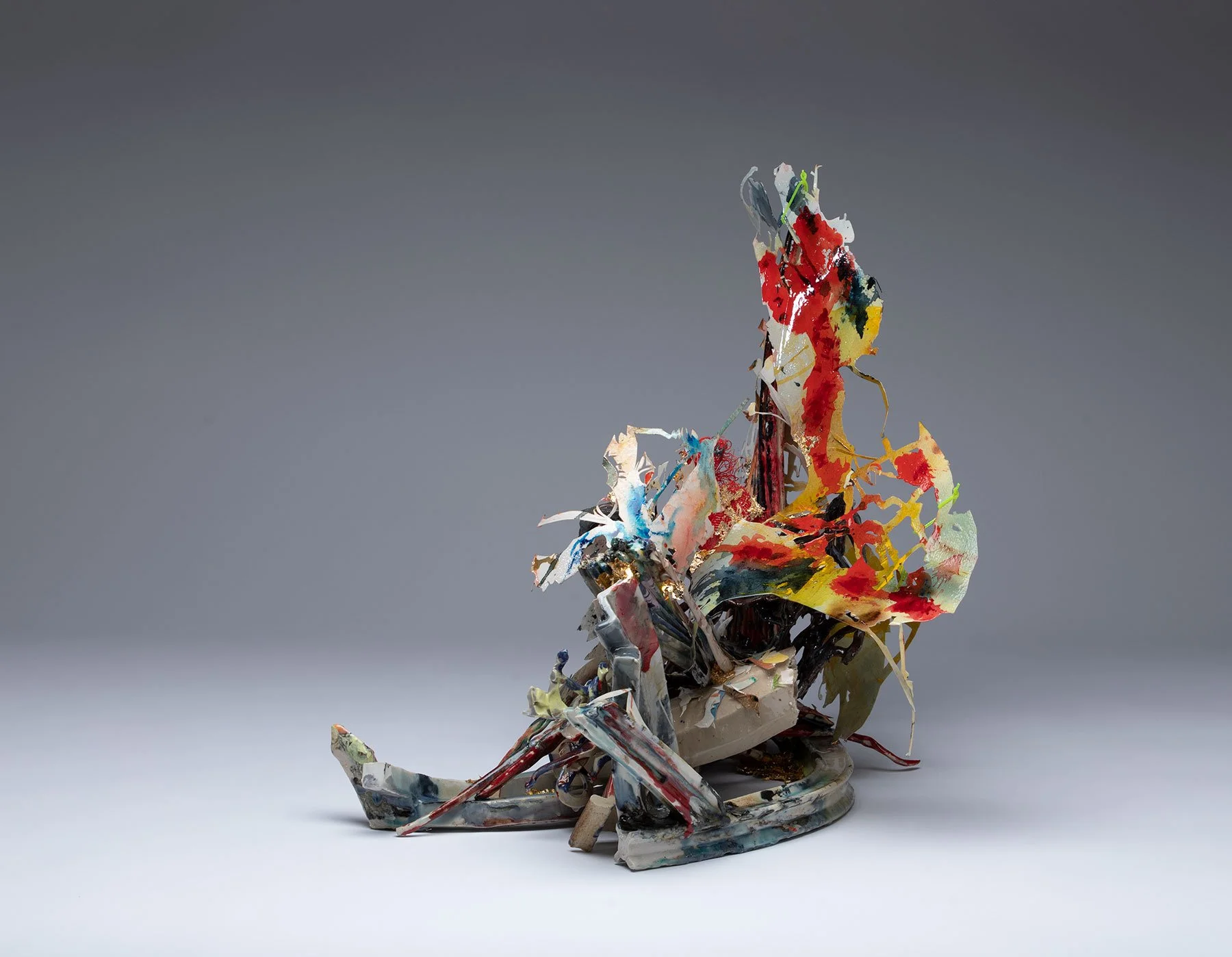 Glazed ceramic, gold leaf, found string, discarded plastic 3D misprints, epoxy resin, watercolor on paper